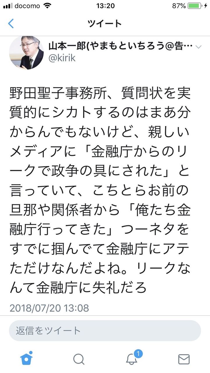 圧力かけようとしたけど失敗して金融庁は野田事務所ガン無視して対処した